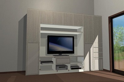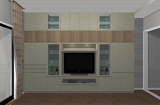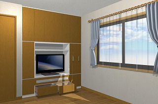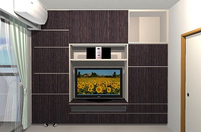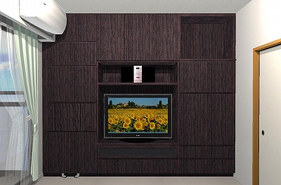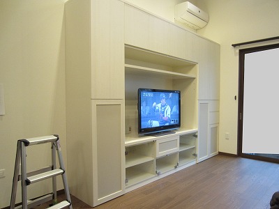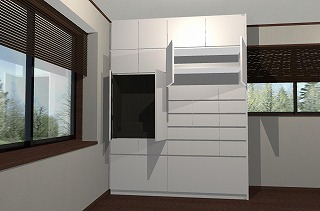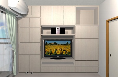 今回は別の部屋にも収納をということでご依頼いただき、テレビ台とクローゼットの一体型に吊り戸棚をプラスしたものを作りました。